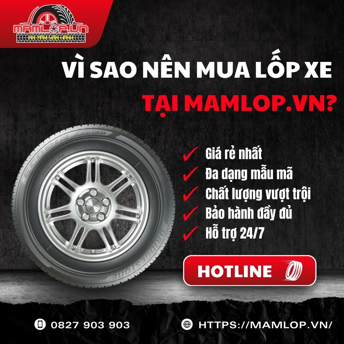 Mamlop.vn là đơn vị phân phối chính thức lốp Bridgestone tại TPHCM, cam kết cung cấp sản phẩm chính hãng xuất xứ Thái Lan với giá từ 1.150.000đ/chiếc – cạnh tranh trên thị trường.
