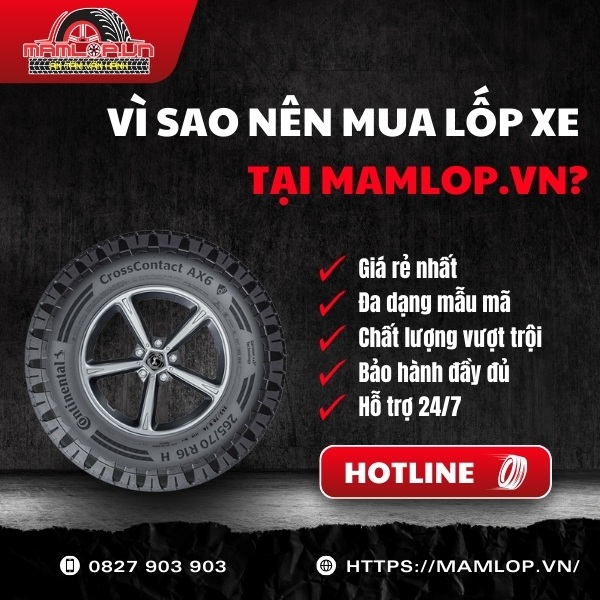 Nhờ hợp chất Silica Tread bền bỉ, kiểu gai mở tối ưu lực kéo và công nghệ giảm ồn tiên tiến, lốp Continental 225/70R15 CrossContact AX6 chính là lựa chọn hàng đầu cho SUV đa địa hình. Đừng bỏ lỡ cơ hội sở hữu sản phẩm chính hãng tại Mamlop.vn, gọi ngay hotline: 0827 903 903 để được tư vấn!