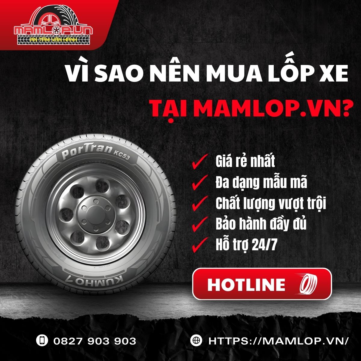 Trên đây là thông tin chi tiết về lốp Kumho 195/70R15C Portran KC53 8PR. Với thiết kế chuyên dụng, tuổi thọ cao và khả năng chịu tải tốt, đây là lựa chọn đáng tin cậy cho xe tải nhẹ. Hãy liên hệ ngay với Mamlop.vn qua hotline: 0827 903 903 để được tư vấn và đặt hàng nhé!